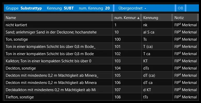 Substrattyp (SubT) Eingabe nur für HB, NHB und NEF nach unten genanntem Schlüssel; im Wesentlichen keine Eingabe für SF. Der Substrattyp charakterisiert das Substrat des Bodens in Verbindung mit der Bodenart. Er kann aus verschiedenen Unterlagen abgeleitet werden (Standortskarte, Digitalisierung, ggf. gutachterliche Einschätzung). Es handelt sich um keine Pflichteingabe.