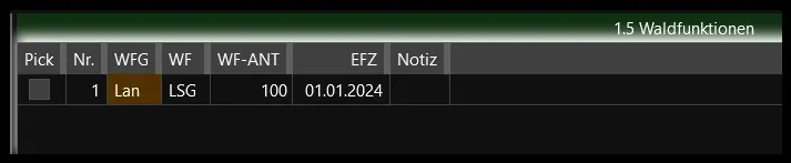 Im folgenden Beispiel wurde für einen Bestand die Waldfunktionsgruppe "Landschaft" mit der Waldfunktion "Landschaftsschutzgebiet" auf 100% der Bestandesfläche erfasst.