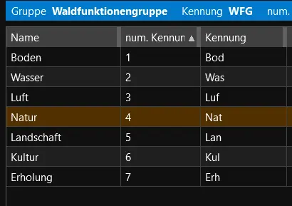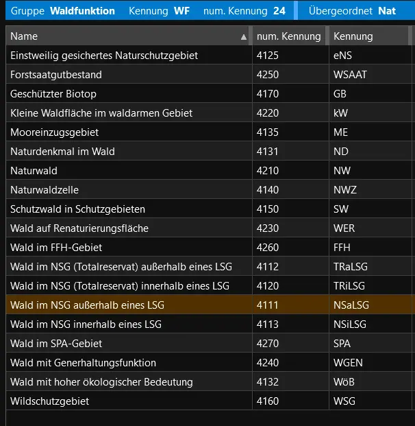 Die komplette Liste der Merkmalsschlüssel für die Waldfunktion finden Sie unter folgendem LINK